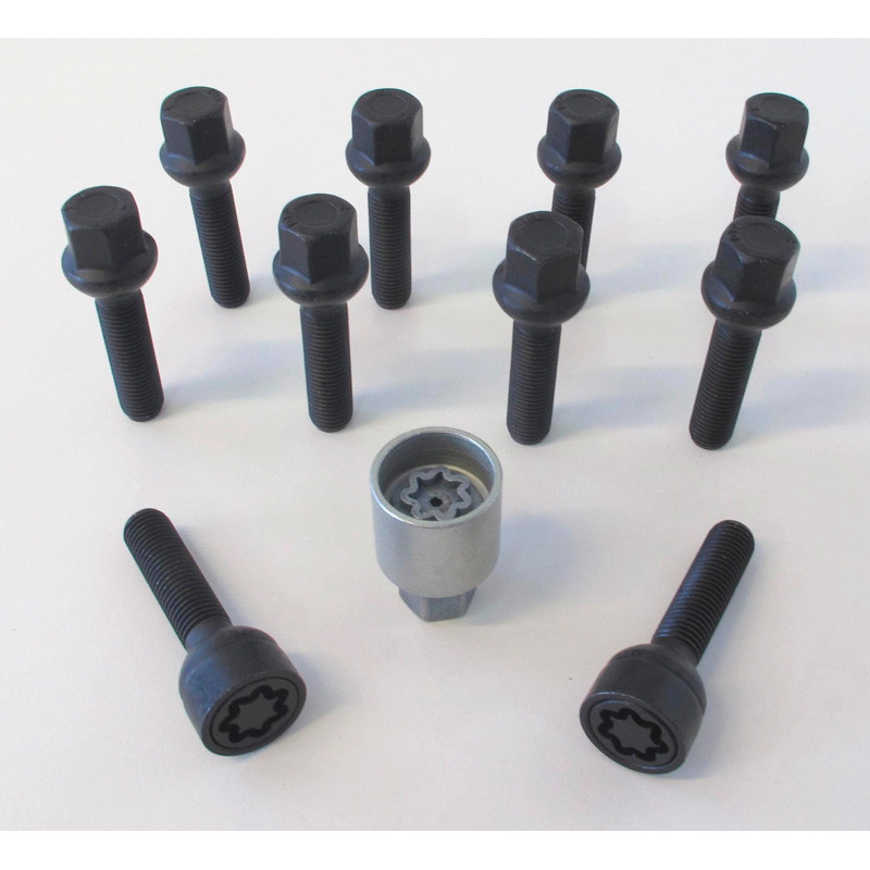 H&R Radschrauben Satz Kugelbund R12 M12x1.50 - Länge 40mm - Schwarz - 10 Stück (z.B. passend für Mercedes) - inkl. Felgenschloss