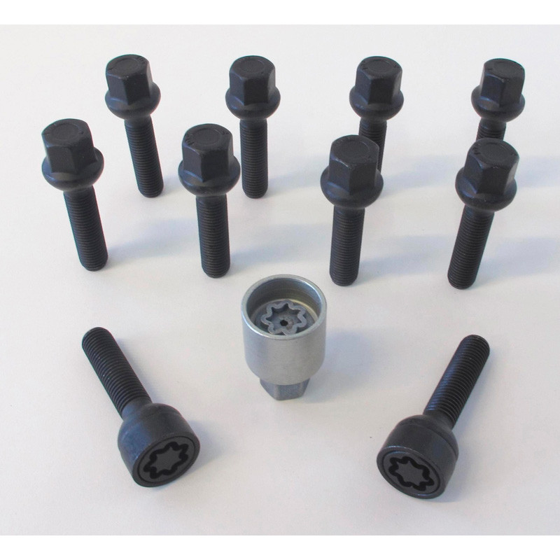 H&R Radschrauben Satz Kugelbund R12 M12x1.50 - Länge 47mm - Schwarz - 10 Stück (z.B. passend für Mercedes) - inkl. Felgenschloss