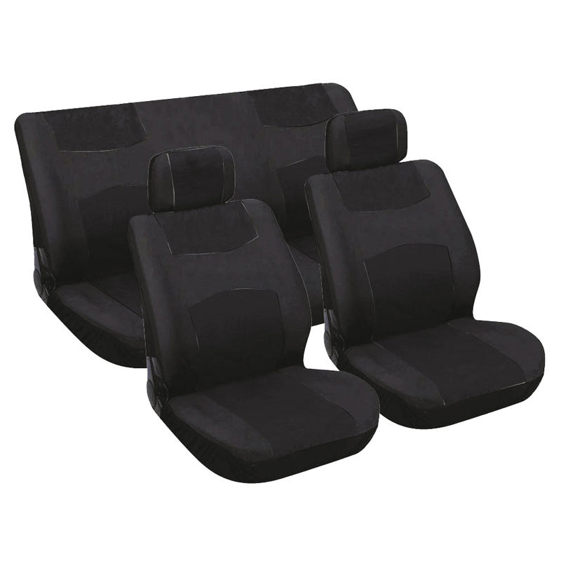 Carpoint Komplettes universelles 6-teiliges Sitzbezug Sat in der Farbe Schwarz. Mittelteil aus starker Baumwolle, Seiten und Rücken aus Polyester mit Schaumstoffeinlage. Das Set besteht aus 2 Vordersitzen, 2 Kopfstützen und einer Rücksitzbank in 2 Teilen (Rücken und Sitz). Nicht geeignet für Fahrzeuge mit Seitenairbag.