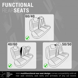 *Der Rücksitzbezug ist mit Reißverschlüssen ausgestattet, die ein teilweises Umklappen des Rücksitzes ermöglichen, aber auch die Möglichkeit bieten die (falls vorhanden) Mittelarmlehne zu nutzen.