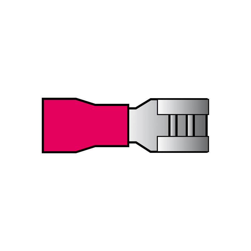 Rote Carpoint isolierte Flachsteckhülse 741 mit der Größe 4.8x0.8mm. Diese Kabelschuhe sind für einen Drahtdurchmesser von 0,5-1,5 mm² geeignet. Länge 18,7mm. 10 Stück in einer Blisterpackung.