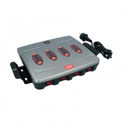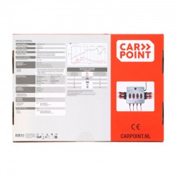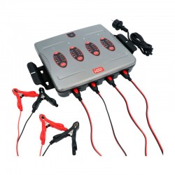Ce chargeur de batterie Carpoint BX-6 convient pour charger simultanément jusqu’à quatre batteries plomb-acide rechargeables de 12 volts 1,2-120 Ah. Le chargeur de batterie passe par un cycle de charge entièrement automatique en 5 étapes. Diagnostic et charge en masse, vérifie automatiquement l’état de charge de la batterie et démarre la charge par impulsions. Phase en vrac, le courant de charge maximal de 80% de l’énergie est chargé. Phase d’absorption, charge jusqu’à ce que près de 100% soit atteint. Phase de charge goutte à goutte, la batterie est maintenue au niveau maximum. Phase de charge de maintenance, démarre lorsque la tension de la batterie descend en dessous d’un certain niveau. Courant de charge maximum 16 ampères. Le chargeur de batterie CP-6 est livré avec quatre jeux de câbles pour charger les batteries, tous les ensembles ont deux câbles à code couleur différent équipés de bornes de batterie. Tous les câbles sont équipés d’une déconnexion rapide. Quatre écrans distincts pour chaque batterie à charger, chaque écran dispose d’une touche de mode pour basculer entre différents modes de charge et contrôler les voyants LED pour une polarité incorrecte et quatre voyants LED indiquant le pourcentage de charge (25/50/75 ou 100% plein).