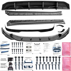 Le kit comprend : spoiler avant, spoiler arrière, bas de caisse, diffuseur, splitters latéraux arrière