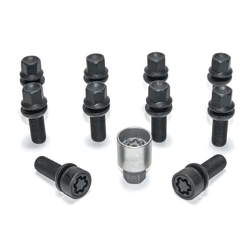 Jeu de Boulons de roue H&R sphérique avec cône mobile R13 M14x1.50 - Longueur 42mm - Noir - 10 pièces (p.e. sur mesure pour Audi S5) - antivol de roue inclus