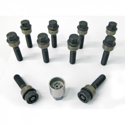 Jeu de Boulons de roue H&R conique-bombé avec col mobile R14 M14x1.50 - Longueur 44mm - Noir - 10 pièces (p.e. sur mesure pour Porsche) - antivol de roue inclus Set de boulons à 8 pièces avec 2 pièces de antivol de roue inclus + adaptateur Taille de clé 19mm