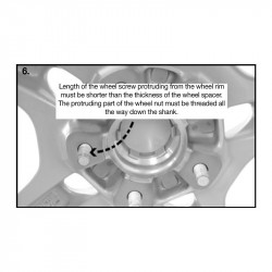 L'élargisseur doit être montée sur le moyeu axial à l'aide des boulons de fixation fournis. Les roues doivent ensuite être montées à l'aide des boulons de roue d'origine fournis avec les roues. La longueur de la vis d'origine dépassant de la jante doit nécessairement être inférieure à la largeur de l'extension de l'élargisseur!