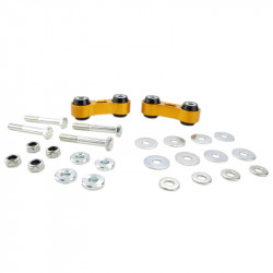 The kit utilises a high tensile extruded alloy link fitted with ultra low compliance synthetic elastomer bushings. Critical hardware is replaced with high tensile components to match the higher loads. The result is much more precise and direct roll control with up to 25% more effective bar rate available at lower wheel deflection points. This does NOT mean an outright increase in your bar rate but rather a quickening of its effect allowing more bar rate earlier. Link shape and bush mounts are designed to allow maximum sway bar articulation to ensure full suspension travel while acting more directly under vertical load. Standard length maintains correct sway bar operation.