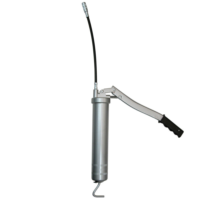 Gris métallisé. Permet d'utiliser de la graisse en vrac ou en cartouches. Complet avec flexible renforcé et agrafe 3-mors.