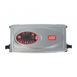 This Carpoint BX-5M battery charger is suitable for charging 12 and 24 Volt 50-500 amp (12V) and 25-100 amp (24V) rechargeable lead acid batteries and 25-100 amp lead calcium batteries and 12 Volt 50-500 amp Lithium-ion batteries. The battery charger goes through a fully automatic charging cycle in 9 steps. Diagnosis and bulk charge phase, checks the condition of the battery and in case of severely discharged batteries, the battery is charged with pulse charging with high and low current to restore the battery. Bulk phase, maximum charging current of 80% of the energy is charged. Absorption phase, charging until almost 100% is reached. Analysis phase, checking the state of charge. Drip charging phase, battery is maintained at maximum level. Maintenance charge phase, starts when battery voltage falls below certain level. Quick charge phase, restores severely discharged batteries with high charge voltage. Manual special maintenance phase, With constant voltage and current, trickle charging is performed. Power supply phase, Used as power supply with maximum capacity when output voltage becomes lower than 12V. Maximum charging current 25 amps. The CP-5M battery charger is supplied with two different colour-coded cables. One cable equipped with battery clamps for charging disconnected batteries and one cable with eye terminals (Ø8.5mm) for permanently connected batteries. Both cables are equipped with a quick connector. Clear display with: mode key to switch between different battery types and between amp/voltage and percentage charge. Indicator lights for error messages. Further equipped with quick charge and memory function, night charge mode and power mode.