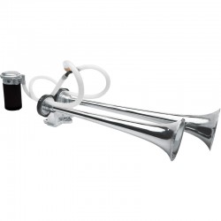 Single-tone 24-volt air horn. Produces a sound of 118 dB. Frequency of the horns are 480 and 520 Hertz. Complete set with 2 air horns, electronic compressor and mounting and connection materials.