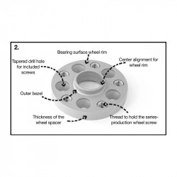 The wheel spacer should be fitted to the axial hub using the fastening bolts provided. The wheels should then be fitted using the existing wheel bolts provided with the wheels. The length of the existing screw sticking out of the rim, must necessarily be smaller than the width of the wheel spacer!