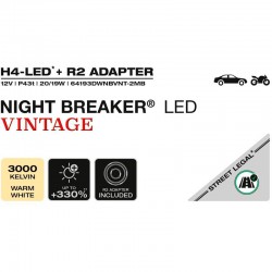 With the street legal NIGHT BREAKER LED VINTAGE H4, OSRAM brings cutting-edge LED technology to the world of vintage vehicles, combining modern performance and technology with timeless style. It not only illuminates the road in front of you but also makes the character of your vehicle shine in new brilliance. With its warm white color temperature of up to 3000 Kelvin, this street-legal LED lamp not only creates the characteristic light color of an incandescent lamp and a nostalgic glow that stays true to the character of classic cars but also impresses with up to 330% more brightness, while the glare for other road users is up to 50% lower than the maximum permissible values. It blends seamlessly with the overall appearance and aesthetic of vintage vehicles, combining an authentic look with safety, vision and visibility. Equipped with an additional R2 adapter, the NIGHT BREAKER LED VINTAGE H4 is not only suitable as a retrofit lamp for H4 lamps and bases but can also be installed in headlamps with R2 bases. The integrated “Constant-Brightness” technology ensures consistent, reliable light output even with fluctuating and low battery voltage - for impressive performance and consistent brightness and for a carefree feeling on every ride. Thanks to the premium OSRAM quality, the lamp is not only robust and vibration-resistant, efficient and durable, but also impresses with a service life that is up to six times longer than that of conventional halogen lamps. In addition, it does not emit any UV radiation and therefore the reflector and lens of the original headlamp can remain undamaged. The NIGHT BREAKER LED VINTAGE H4 is not just a light source, but a statement for the preservation of the original nostalgic appearance and combines history with the future. Additionally, OSRAM offers a dedicated guarantee on all NIGHT BREAKER™ LED retrofit lamps.