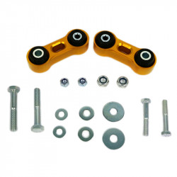 The kit utilises a high tensile extruded alloy link fitted with ultra low compliance synthetic elastomer bushings. Critical hardware is replaced with high tensile components to match the higher loads. The result is much more precise and direct roll control with up to 25% more effective bar rate available at lower wheel deflection points. This does NOT mean an outright increase in your bar rate but rather a quickening of its effect allowing more bar rate earlier. Link shape and bush mounts are designed to allow maximum sway bar articulation to ensure full suspension travel while acting more directly under vertical load. Standard length maintains correct sway bar operation.