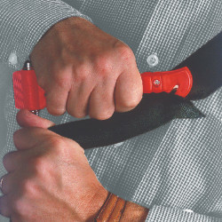 Double headed hammer with hardened points to shatter windows easily and quickly. Built-in, razor sharp Solingen blade for cutting seat belts. Fluorescent knob helps locate LifeHammer in the dark. With switch to prevent mis-use.
