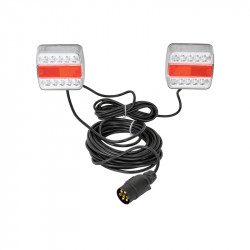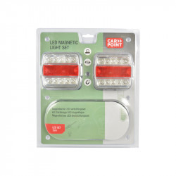 De 12 Volt Carpoint magnetische LED verlichtingsset met E-Keur is handig voor aanhanger of fietsdrager. De verlichtingsset bestaat uit 2 waterdichte vierkante LED achterlichten met aan de achterzijde een grote magneet. Hierdoor zijn de achterlichten makkelijk direct op het plaatwerk van een aanhanger te bevestigen. De achterlichten hebben een 7-polige stekker en een kabel met een lengte van 7,5 meter. De kabel tussen de beide achterlichten is 2,5 meter.