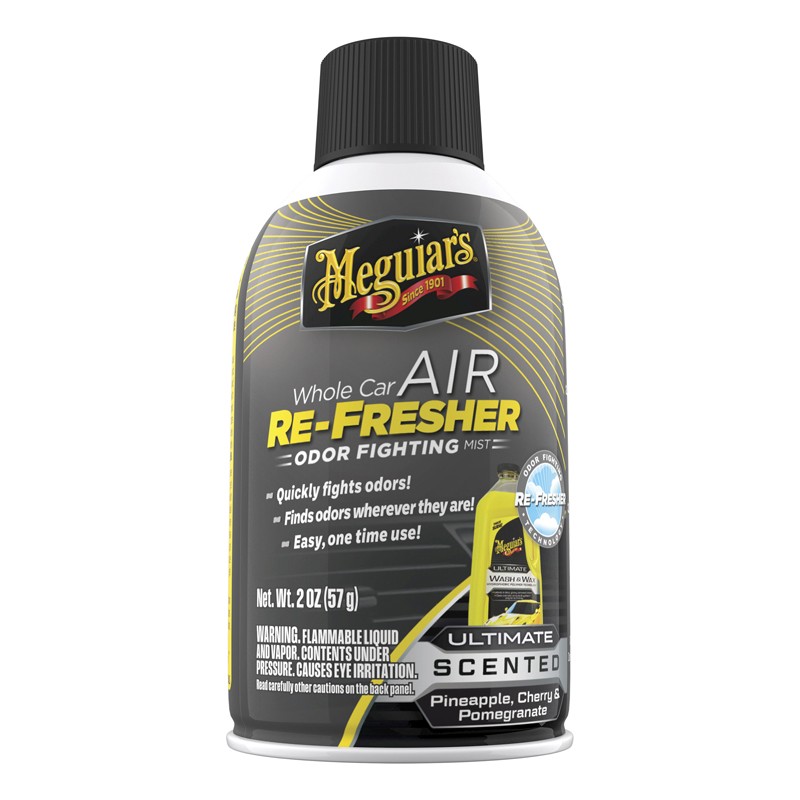 Meguiar’s® Whole Car Air Refresher verwijdert onaangename geuren en vervangt deze door een geur die bekend is van onze Ultimate lijn en bevat tonen van ananas, kers en granaatappel. De spray bestrijdt effectief geuren zoals sigarettenrook, etenslucht en sportuitrusting en vult het interieur met een verfrissende ‘Ultimate’-geur.