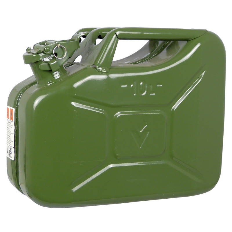 Stevige solide groene Carpoint metalen benzinekan met lekvrije beugelsluiting voor het veilig opslaan en vervoeren van loodvrije brandstof en ethanol E85 (Bio-Ethanol). De jerrycan heeft een inhoud van 10 liter. De Carpoint benzinekan heeft een UN-keur, dit is een keurmerk voor verpakkingen geschikt voor het vervoer van gevaarlijke stoffen.