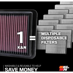 K&N inlegfilter. Het filter gaat net zo lang mee als de levensduur van jouw motor. Als jouw auto een onderhoudsbeurt krijgt wordt er normaal een nieuw filter geïnstalleerd. Een K&N filter kan je gewoon wassen en weer hergebruiken. Hierdoor bespaar je aanzienlijk op het luchtfilter en onderhoudskosten.