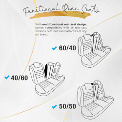 *De achterbankhoes is voorzien van ritsen, deze maken het in delen neerklappen van de achterbank mogelijk, maar biedt ook de mogelijkheid de (mits aanwezige) middenarmsteun te gebruiken