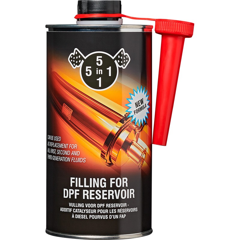 5in1 filling for DPF reservoir is een universele vervanger voor de meeste gangbare roetfiltervloeistoffen die door diverse fabrikanten worden gebruikt in vloeistofdoseersystemen voor roetfilters aan boord van dieselmotoren (DPF). De DPF vloeistof verlaagt de verbran- dingstemperatuur van roet zodat deze deeltjes snel, volledig en regelmatig zullen verbranden bij lagere temperaturen bij het regenereren van het DPF. Dit resulteert in een langere levensduur van het DPF en een probleemloze werking van uw DPF-systeem.
